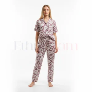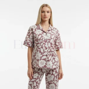 Magic Cotton Co-Ord Set – Peach with Brown & White Leaf Print (Short Oversized Top)