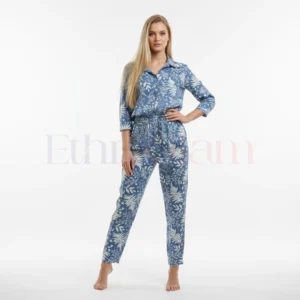 Women’s long rayon kurti pyjama set in dark blue with shimmer floral print. Includes loose-fit kurti and elastic waist pyjama with pocket. Lightweight, breathable, and non-transparent fabric.