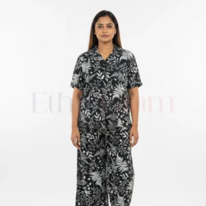 The Magic Cotton Co-Ord Set in Peach with Brown and White Leaf Print is designed for women who appreciate soft colors, breathable fabrics, and effortlessly stylish silhouettes. Made from premium magic cotton, the set offers a smooth, stretchable, and lightweight feel that keeps you comfortable throughout the day. The oversized short top adds a trendy and relaxed touch, while the elastic waist pants provide a comfortable and flattering fit. The Peach base combined with Brown and White leaf patterns gives the outfit a warm, earthy, and refreshing vibe. Ideal for vacations, brunch outings, travel days, shopping trips, home lounging, or everyday casual wear, this co-ord set blends comfort and modern style perfectly.