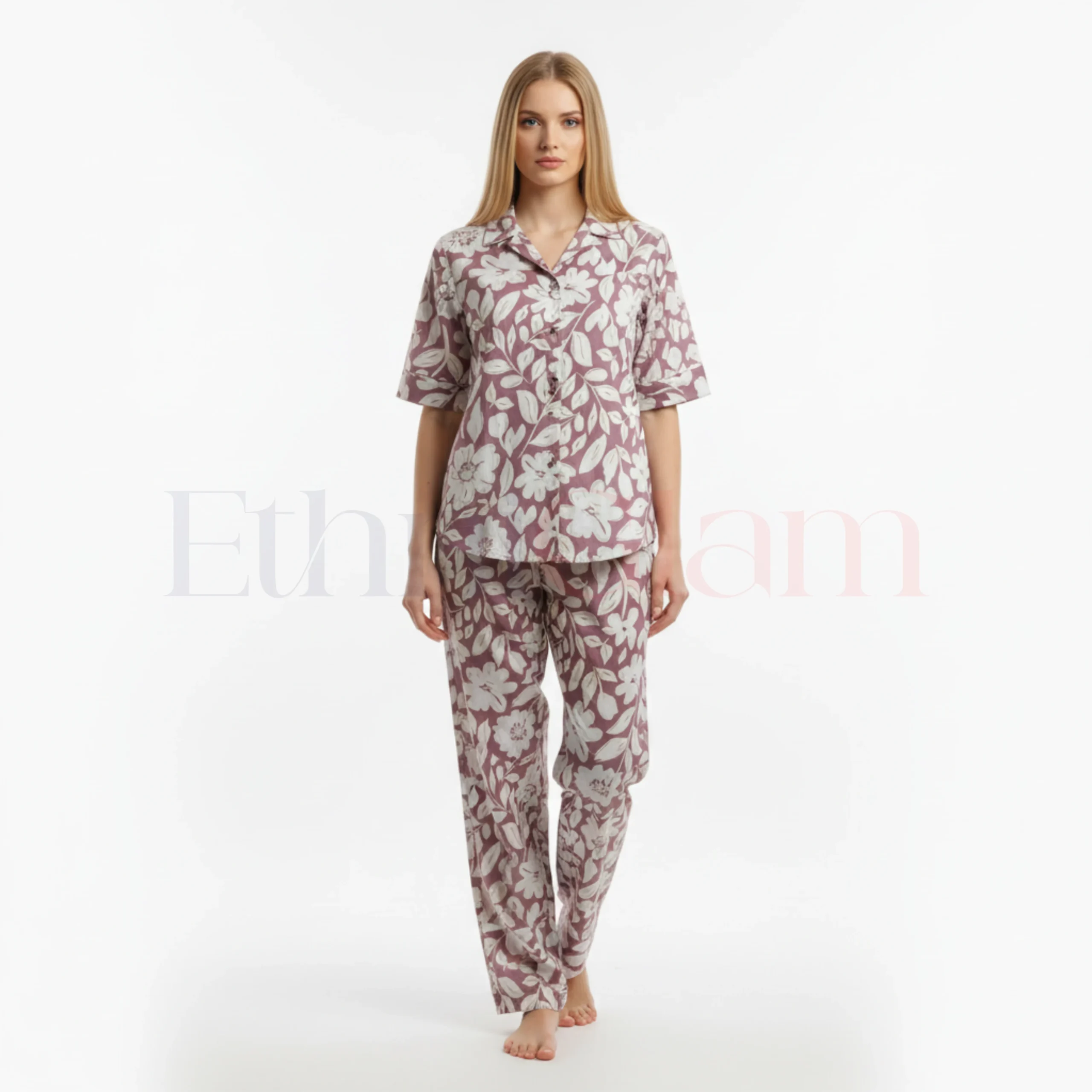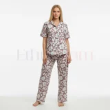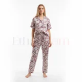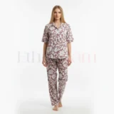 Women’s magic cotton co-ord set with oversized short top and elastic waist pants in Peach with Brown and White leaf print. Soft, breathable, stretchable, and non-transparent fabric.