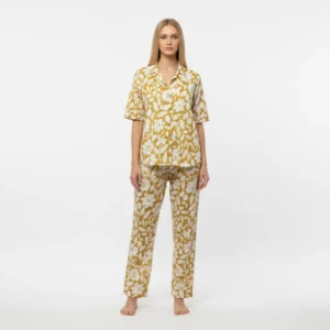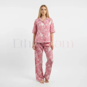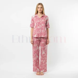 Women’s magic cotton co-ord set with oversized short top and elastic waist pants in Purple with white leaf print. Soft, breathable, stretchable, and non-transparent fabric.