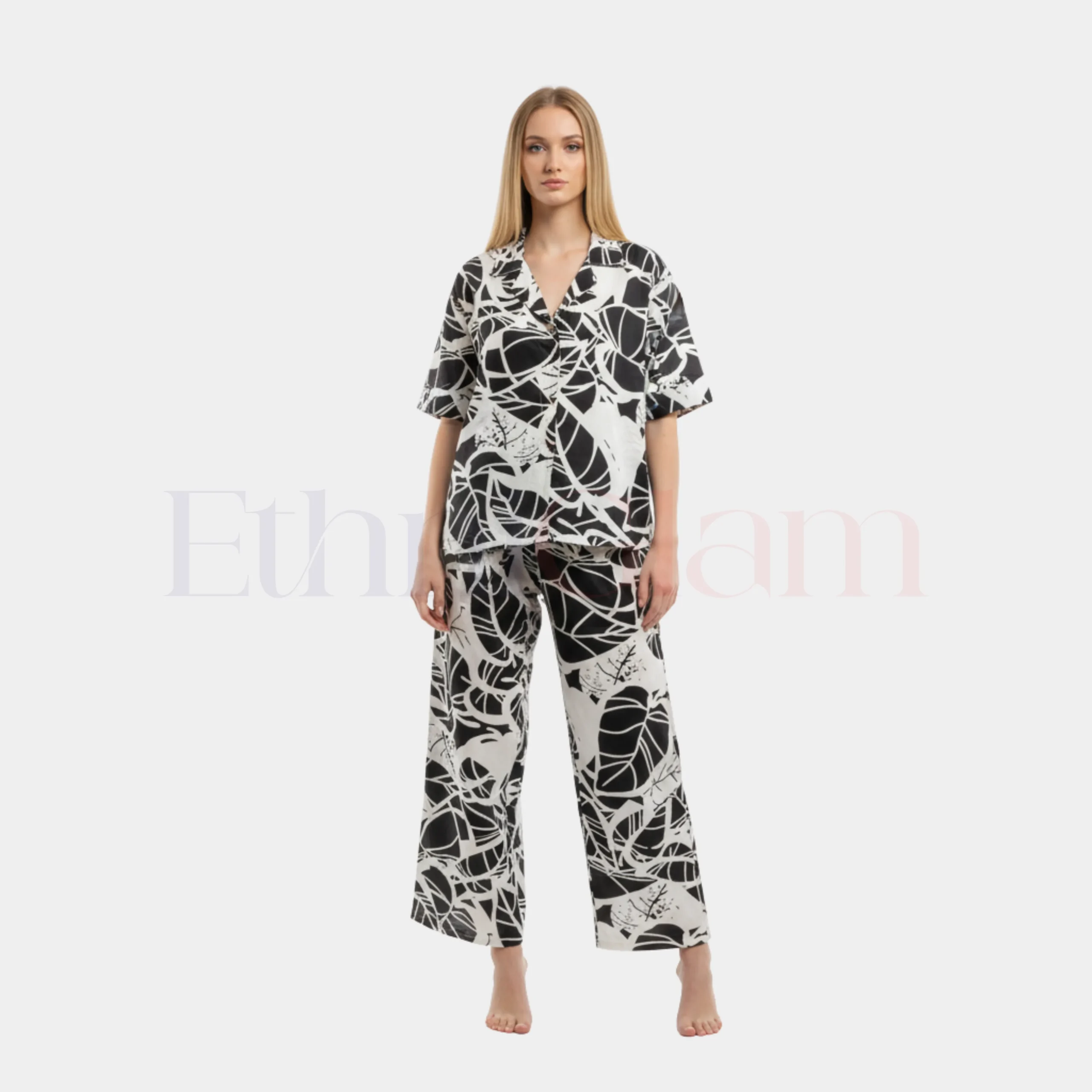 Effortless style meets all-day comfort in this chic Popcorn Short Coord Set. Designed in a bold dark-black base with striking white abstract prints, this loose-fit set offers a relaxed silhouette that flatters every body type. The breathable fabric feels soft on the skin, making it perfect for casual outings, home wear, vacations, and airport looks.
