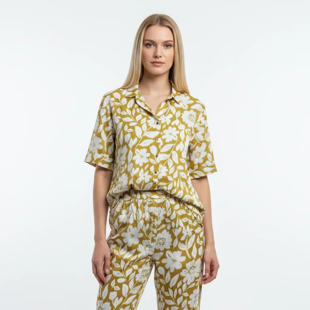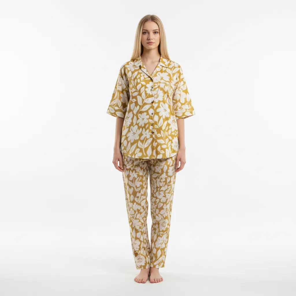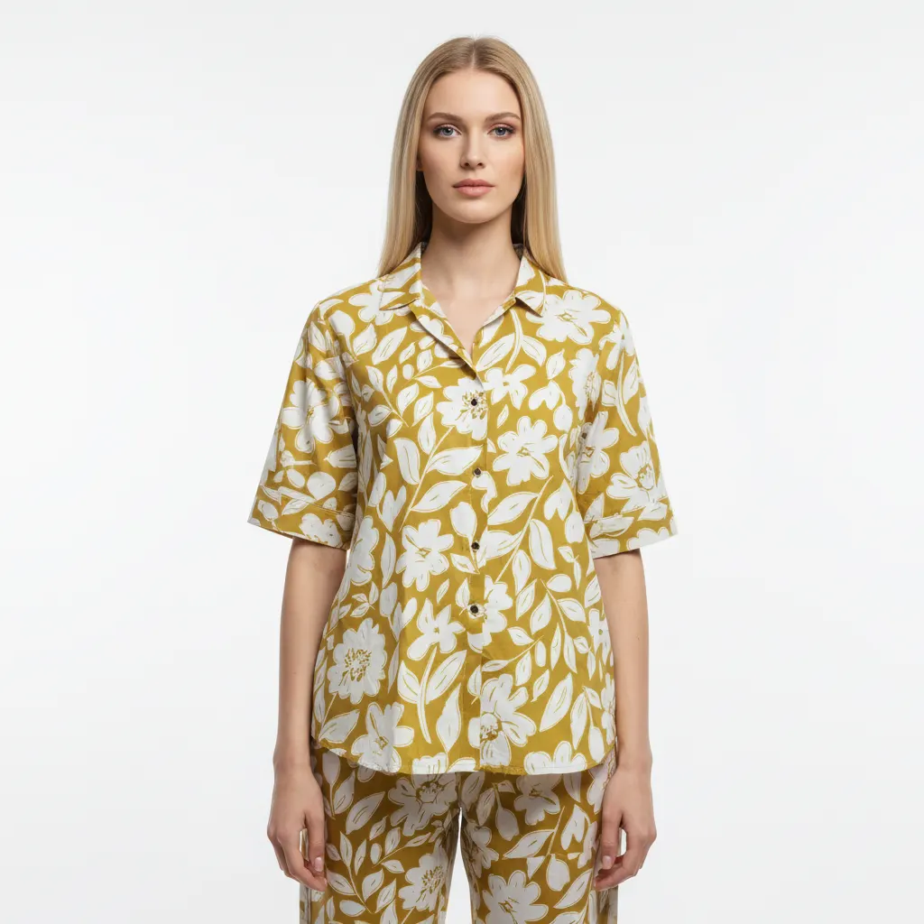 Women’s co-ord set with a loose-fit shirt and elastic waist wide-leg pants in Mustard Yellow with a white floral print. Pants have no pockets. Lightweight, soft, and non-transparent fabric ideal for daily comfort.